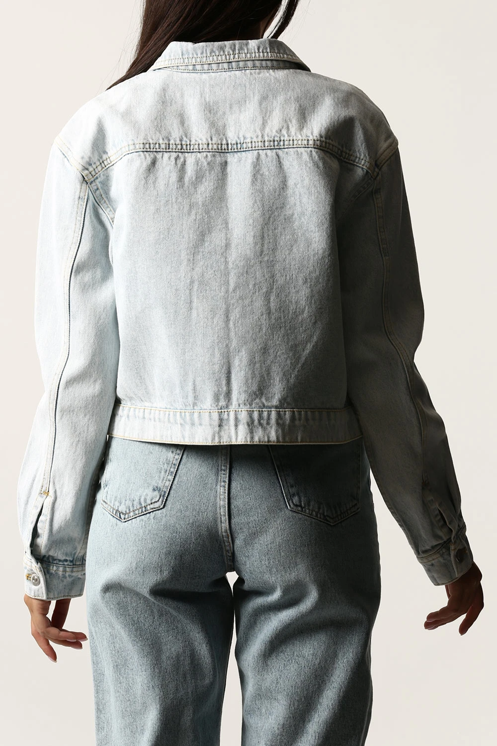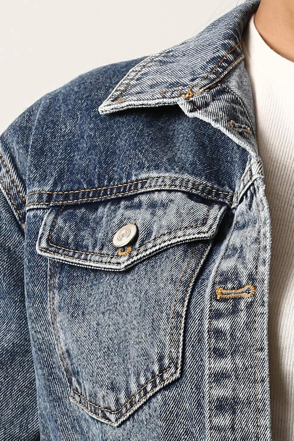 کت کراپ جین یک آیتم پاییزی جذاب و کاربردی برای استایل های کژوال است. روی قسمت سینه کت کراپ جیب در نظر گرفته شده است. قد آستین بلند و دم آستین مچ دارد. کپ لباس نیز اسلیم میباشد. استایل لباس کژوال و مناسب فعالیت های روزانه است پارچه جین و الیاف به کاررفته در پارچه لباس 100٪پنبه است. سایز پوشیده شده مدیوم و قد لباس 47 سانت است. قد مدل 168 سانت است.